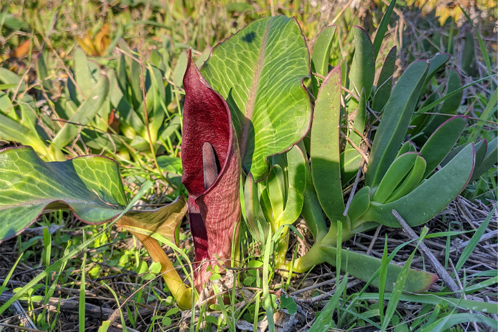 Descrizione: L’Arum pictum L. è una pianta erbacea perenne provvista di rizoma alta fino a 50 cm. Le poche foglie, solo 1 - 2 le altre tardive e svernanti, sono radicali con disposizione a spirale. L’infiorescenza, da ottobre a novembre, è di colore rosso-violaceo posti nella parte bassa dello spadice e formanti un glomerulo grossolano e cilindrico. I frutti sono bacche, prima bianche poi verdi e rosso brillante a maturazione.
