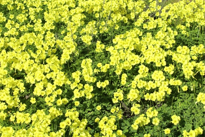 Sebbene l'acetosella gialla non produca semi, è ugualmente difficile da controllare perché ogni singola pianta è in grado di produrre un gran numero di bulbi molto persistenti. Infatti in primavera ogni pianta produce una ventina di bulbilli che rimangono dormienti per tutta l'estate e germogliano in autunno; la fioritura ha luogo in inverno e si protrae fino in primavera quando la parte aerea scompare chiudendo il ciclo riproduttivo. Anno per anno, questa serie di meccanismi vitali consente alla specie di produrre elevate quantità di bulbilli e di conseguenza permette una diffusione molto rapida della pianta rendendola altamente infestante. Attività agricole e urbane che comportano un rimescolamento del suolo intensificano questo processo invasivo.